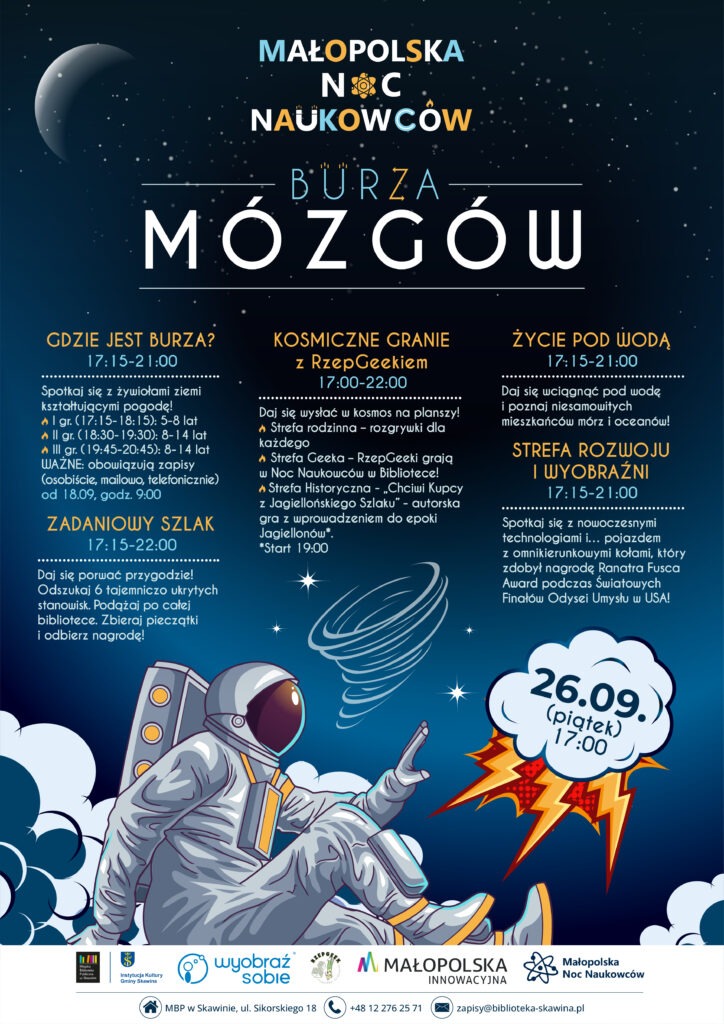 26.09.2025 r. (piątek), godz. 17:00 - 22:00 - Małopolska Noc Naukowców- dla mężczyzn lubiących naukowe wrażenia i nie tylko: będą planszówki, będzie pokaz zjawisk atmosferycznych i wiele innych atrakcji.
