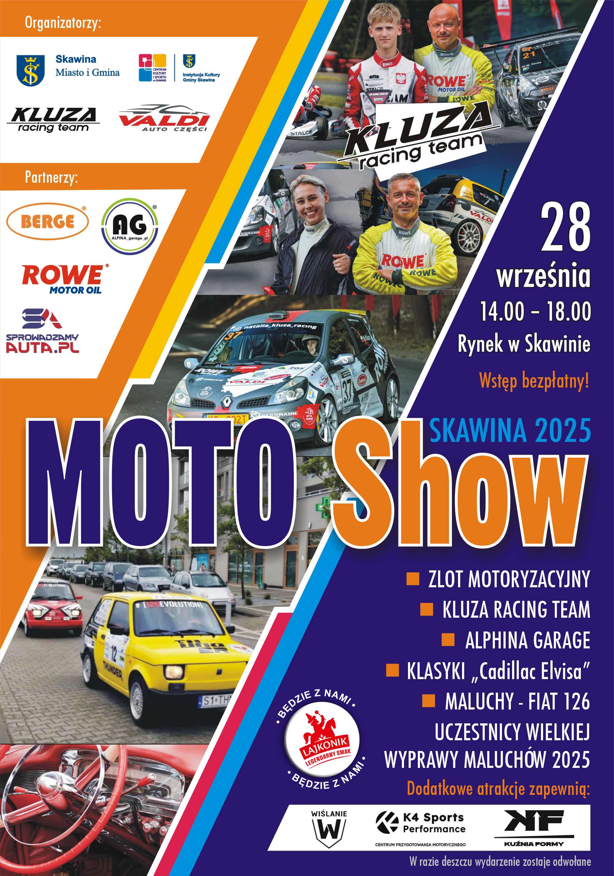 28.09.2025 r. (niedziela), godz. 14:00 - Moto Show Skawina 2025 - po raz drugi Skawina stanie się małopolską stolicą motoryzacji, a wszystko za sprawą Kluza Racing Team – zespołu wyścigowego, który stworzy prawdziwe święto dla wszystkich miłośników szybkich i pięknych samochodów.