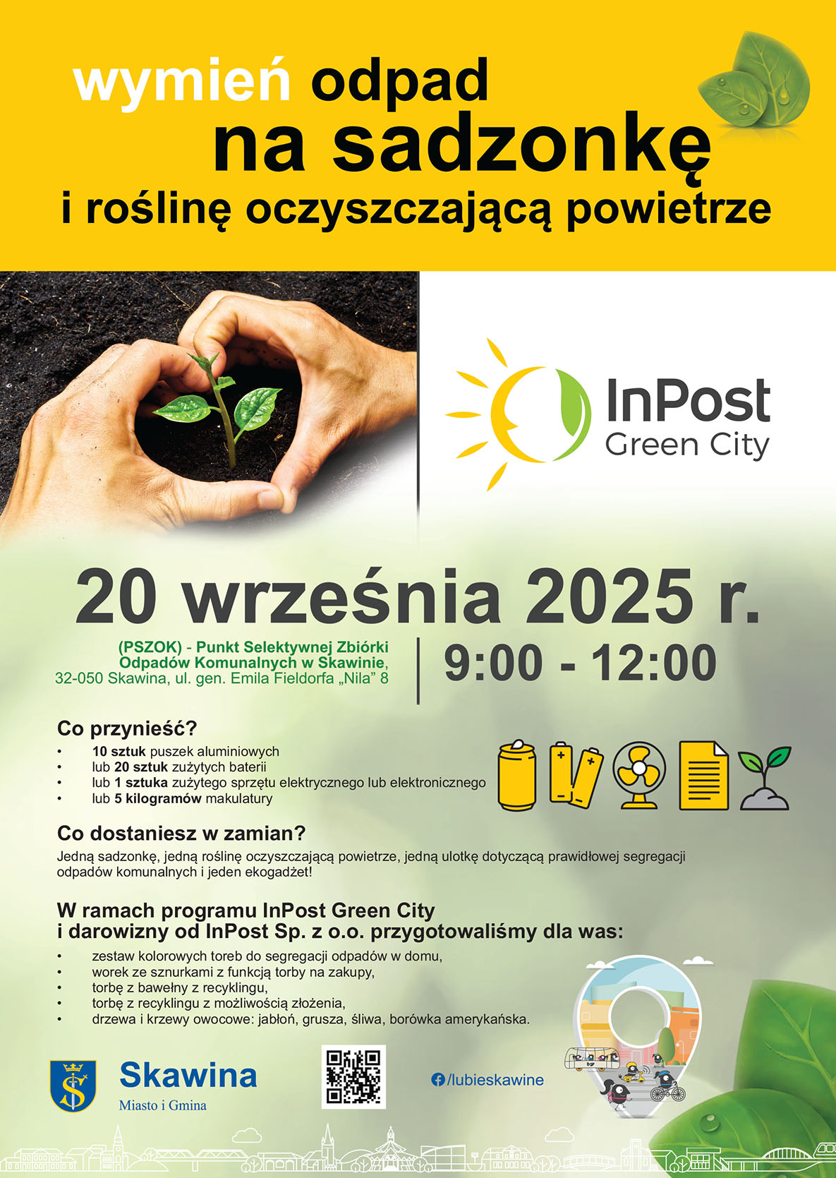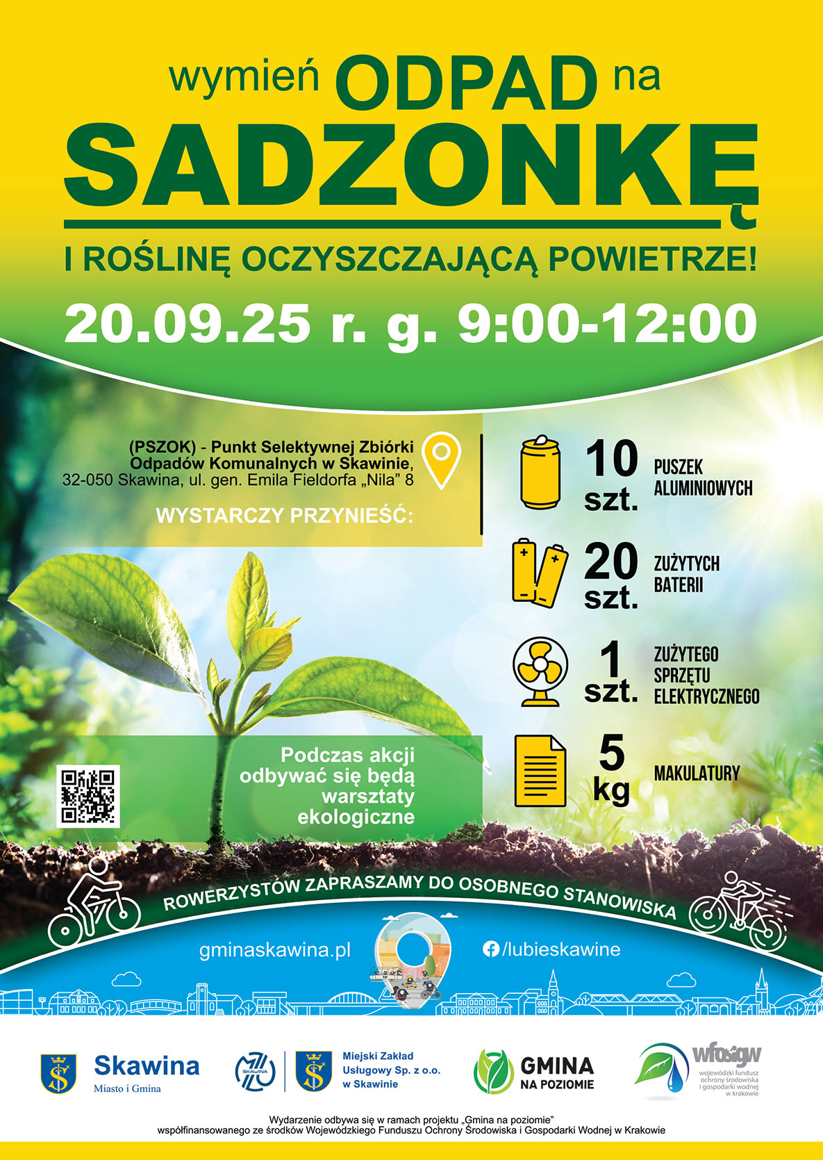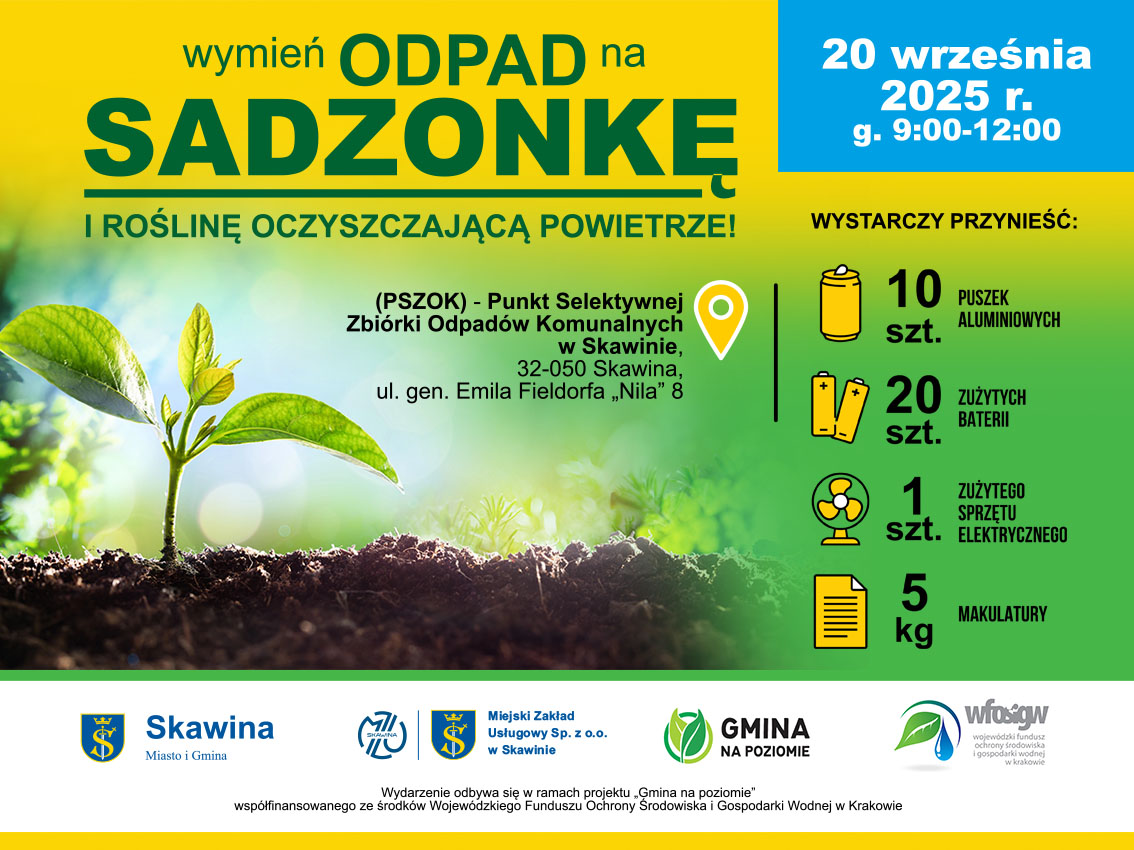 Zbiórka surowców wtórnych odbędzie się w dniu 20 września 2025 roku w godz. 9:00 – 12:00 lub do wyczerpania sadzonek na terenie Punktu Selektywnej Zbiórki Odpadów Komunalnych w Skawinie (PSZOK), 32-050 Skawina, ul. gen. Emila Fieldorfa „Nila” 8.