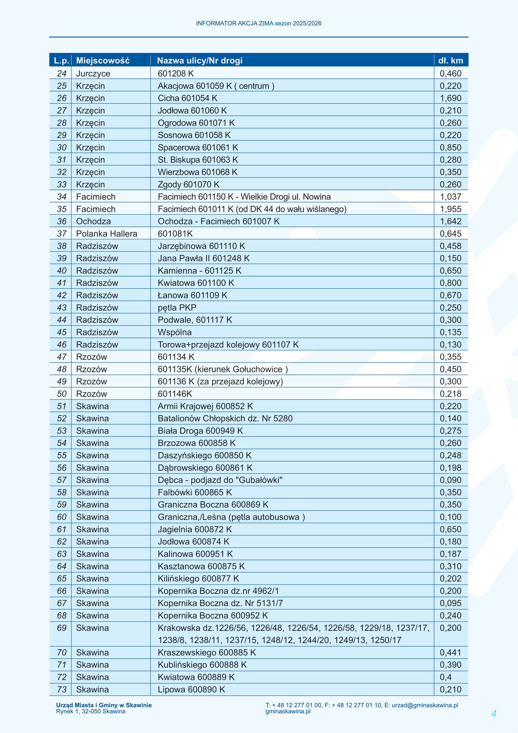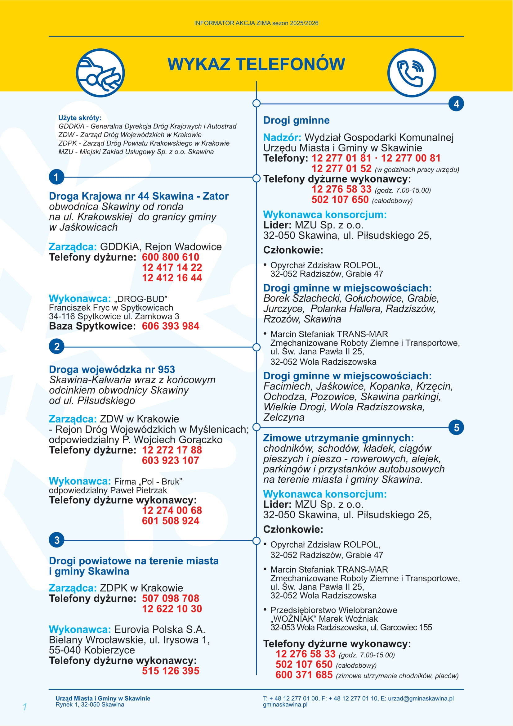 Wszystkie niezbędne numery telefonów oraz wykazy zarządców znajdują się w Informatorze zimowym „Zima 2025/26”, udostępnionym w załączniku pod tym artykułem.