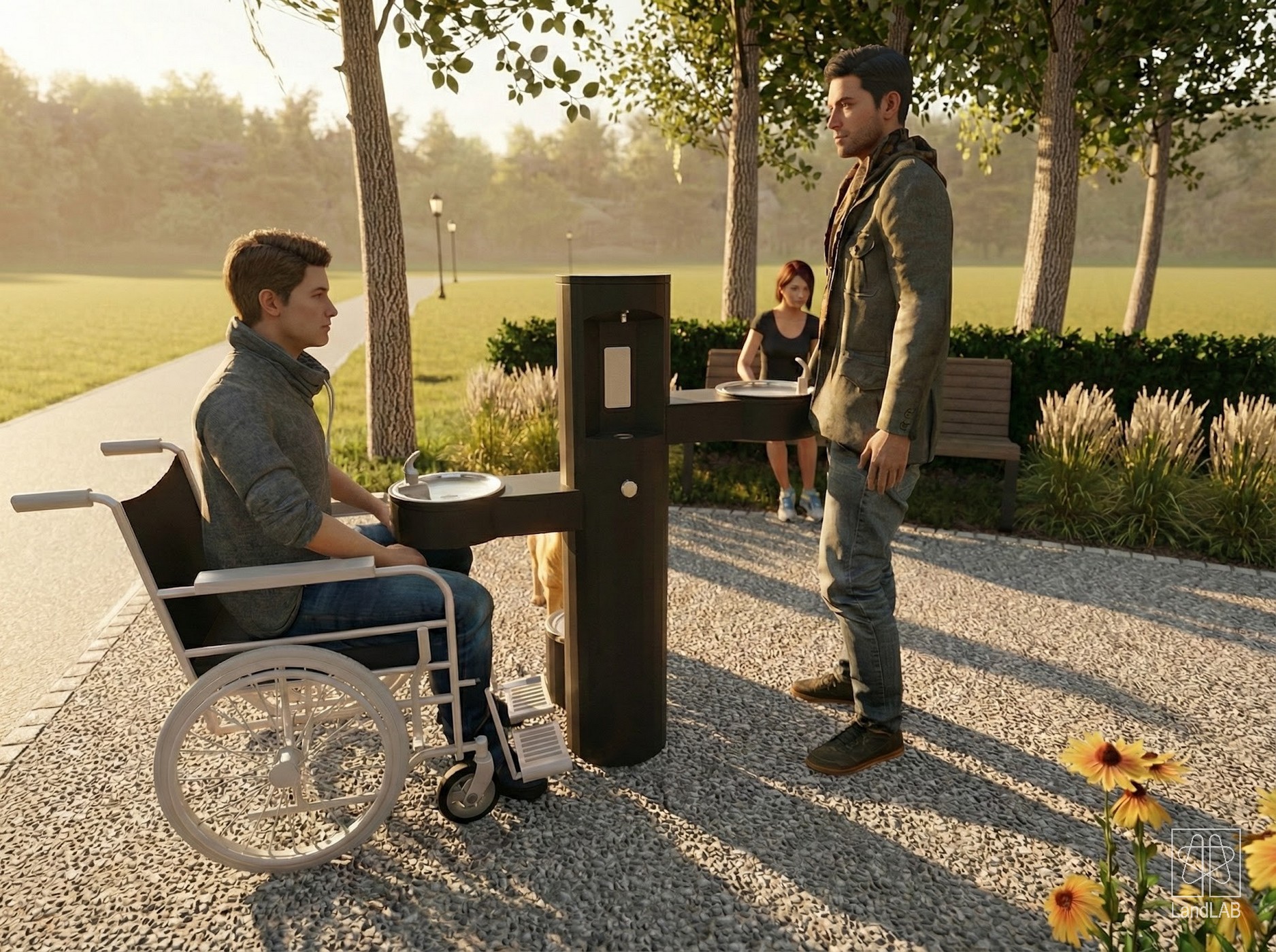 - Druga kabina to toaleta uniwersalna, także w pełni bezdotykowa i wyposażona w system automatycznego spłukiwania, wentylację, oświetlenie oraz ogrzewanie podłogowe.