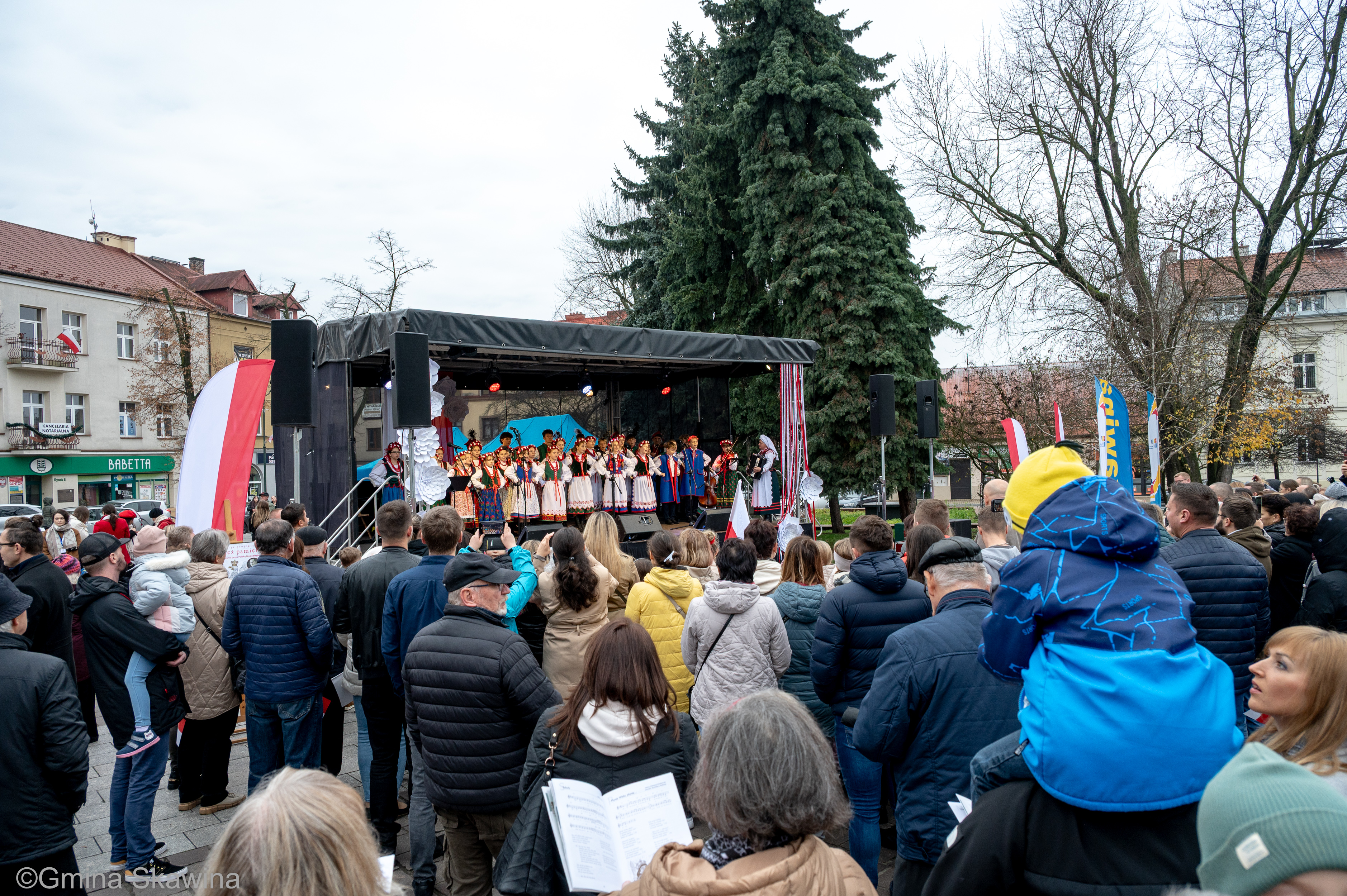 Na Rynku w Skawinie mieszkańcy wspólnie odśpiewali hymn narodowy, a następnie uczestniczyli w otwarciu plenerowej wystawy „Pamiętajmy o Sybirakach”, przygotowanej przez Fundację Znaki Pamięci. Szczególnym momentem była chwila, gdy zespół folklorystyczny TAKOGODKA z Borku Szlacheckiego zaprosił zgromadzonych do wspólnego zatańczenia poloneza – tańca, który od pokoleń symbolizuje jedność i dumę narodową. Zatańczyliśmy razem, tworząc obraz wspólnoty i radości z wolności. Wzruszającym momentem był także apel pamięci i minuta ciszy ku czci Sybiraków, którym towarzyszył sygnał „Śpij kolego…”.