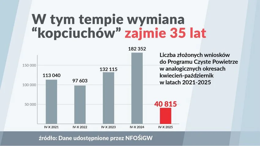 Z analizy Polskiego Alarmu Smogowego wynika, że jeśli zainteresowanie programem nadal będzie utrzymywać się na tak niskim poziomie jak obecnie, to wymiana 2,5 mln starych pieców zajmie ponad 30 lat. - mówi Andrzej Guła z PAS