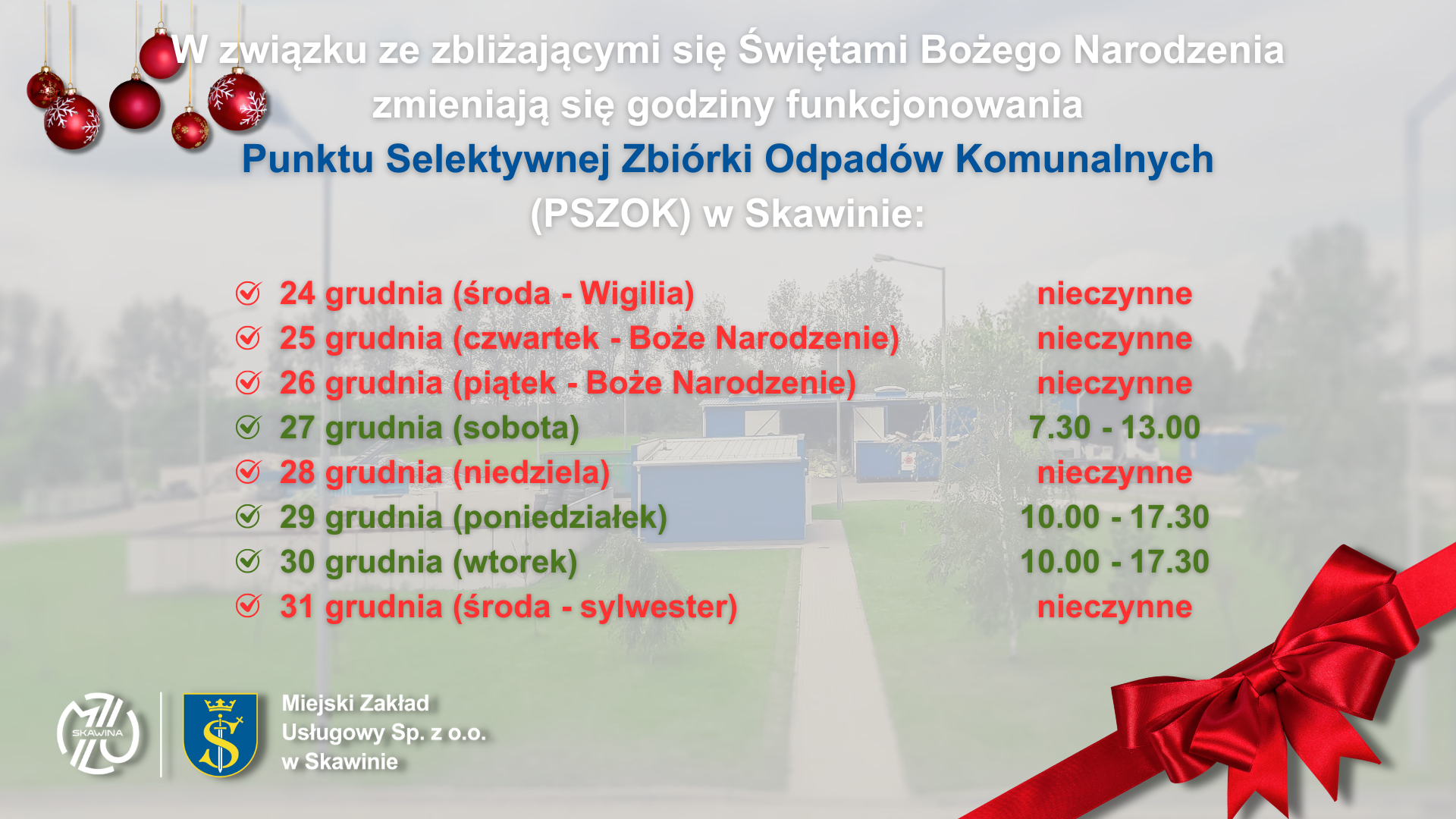 W związku ze zbliżającymi się Świętami Bożego Narodzenia informujemy o zmienionych godzinach funkcjonowania Punktu Selektywnej Zbiórki Odpadów Komunalnych(PSZOK) w Skawinie: