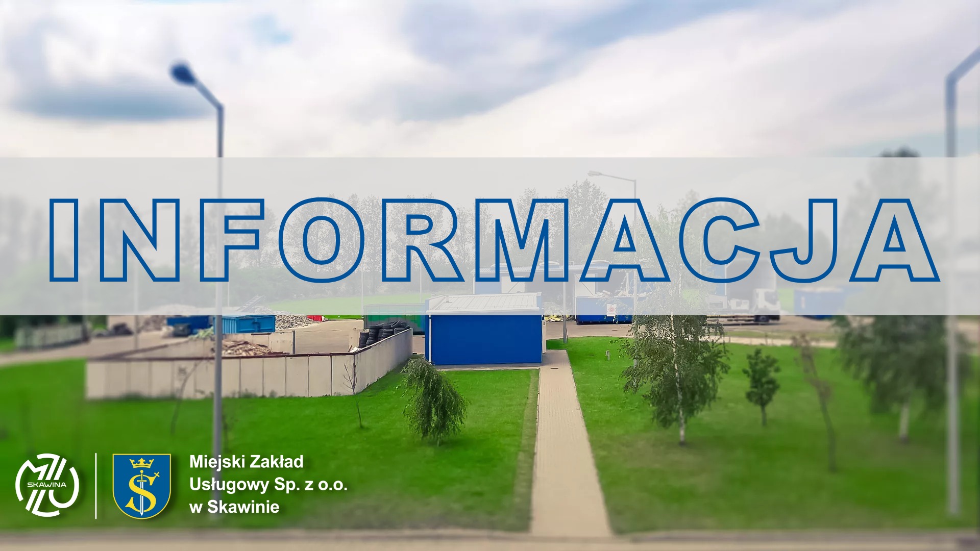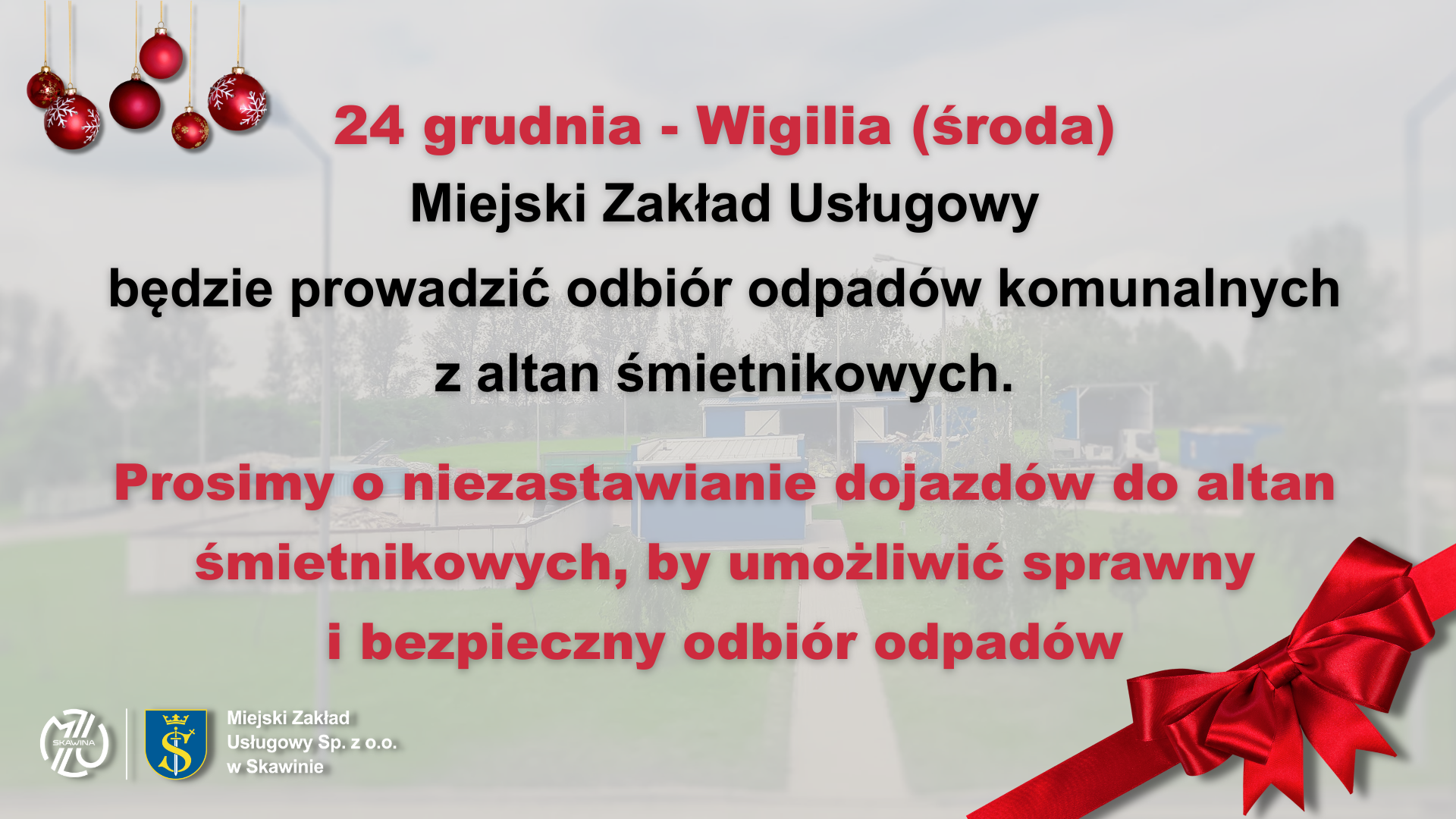 Jednocześnie informujemy, że 24 grudnia (środa – Wigilia) Miejski Zakład Usługowy Sp. z o.o. w Skawinie BĘDZIE prowadził odbiór odpadów komunalnych z altan śmietnikowych. W związku z powyższym prosimy o niezastawianie dojazdów do altan śmietnikowych, aby umożliwić sprawny i bezpieczny odbiór odpadów.