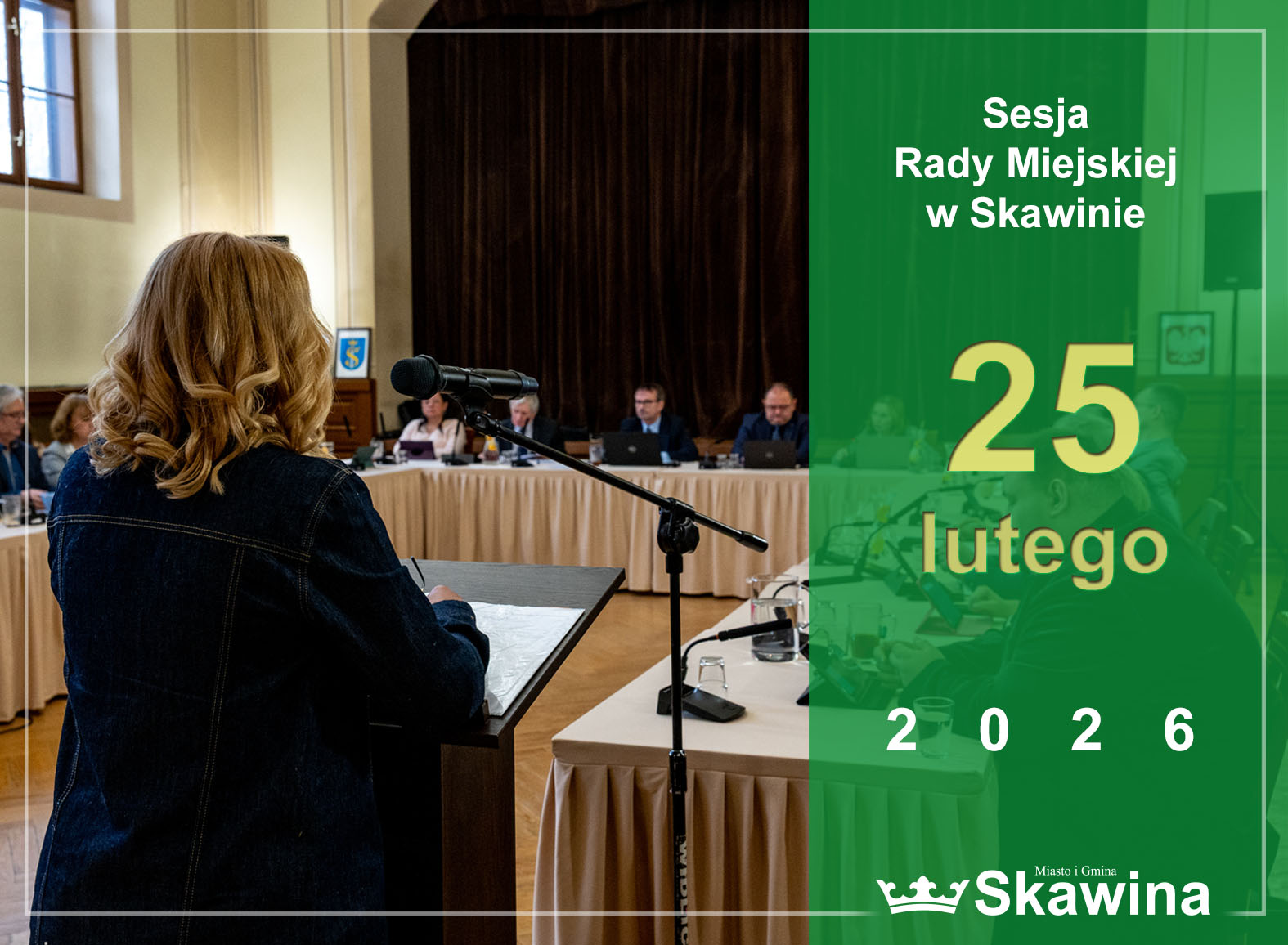 25 lutego 2026 r. o godz. 09:00 w sali Pałacyku „Sokół” w Skawinie, przy ul. Mickiewicza 7 odbędzie się XXIII zwyczajna sesja Rady Miejskiej w Skawinie.