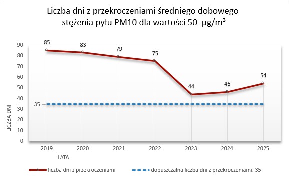 • W 2025 r. zarejestrowano 54 dni z przekroczeniem dopuszczalnego średniodobowego stężenia PM10 (50 µg/m³). Oznacza to wzrost w stosunku do roku poprzedniego (46 dni), lecz nadal jest to wynik znacząco korzystniejszy niż notowany w latach 2019-2022, kiedy liczba dni z przekroczeniami przekraczała 75-85 w skali roku.