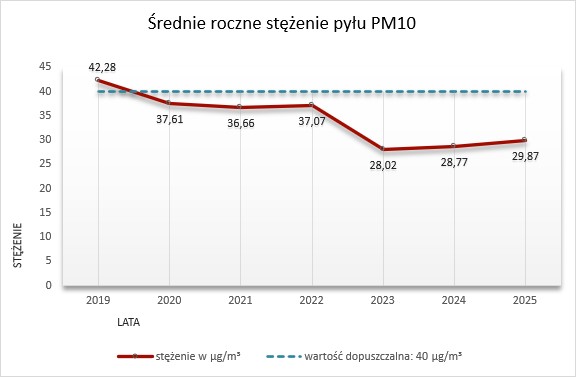 • Średnie roczne stężenie pyłu PM10 wyniosło 29,87 µg/m³, co stanowi około 75% dopuszczalnego poziomu średniorocznego (40 µg/m³). W porównaniu z rokiem 2024 (28,77 µg/m³) odnotowano niewielki wzrost wartości, jednak poziom ten nadal pozostaje wyraźnie niższy niż w latach 2019-2022, a od 2023 utrzymuje się na podobnym poziomie.