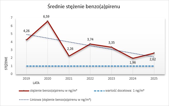 • Średnie roczne stężenie benzo(a)pirenu (B(a)P) wyniosło 2,62 ng/m³, co oznacza przekroczenie poziomu docelowego (1 ng/m³). W porównaniu z rokiem 2024 (1,96 ng/m³) nastąpił wzrost wartości, jednak nadal pozostaje ona istotnie niższa niż w latach poprzednich, kiedy notowano stężenia przekraczające 4–6 ng/m³.