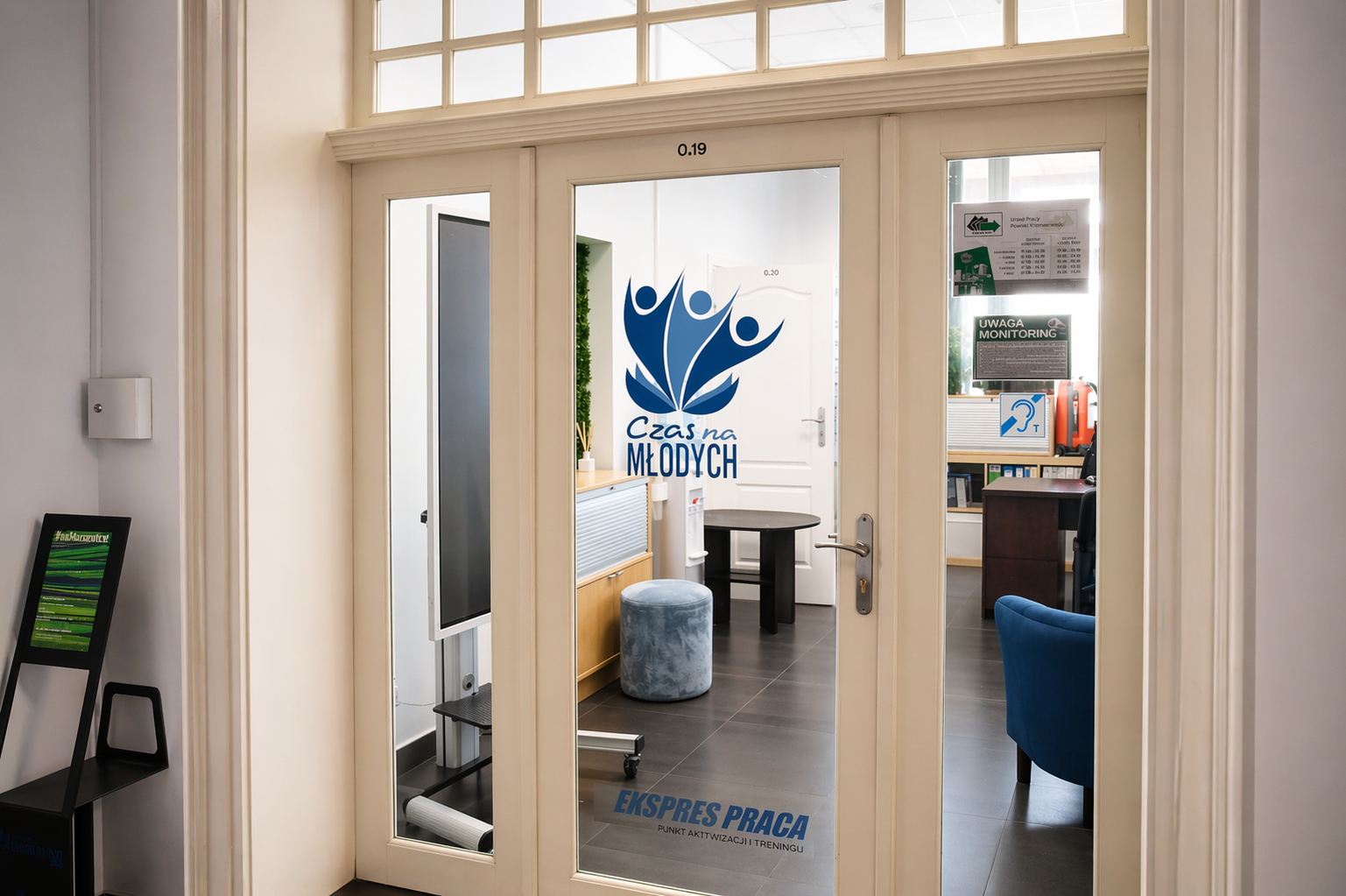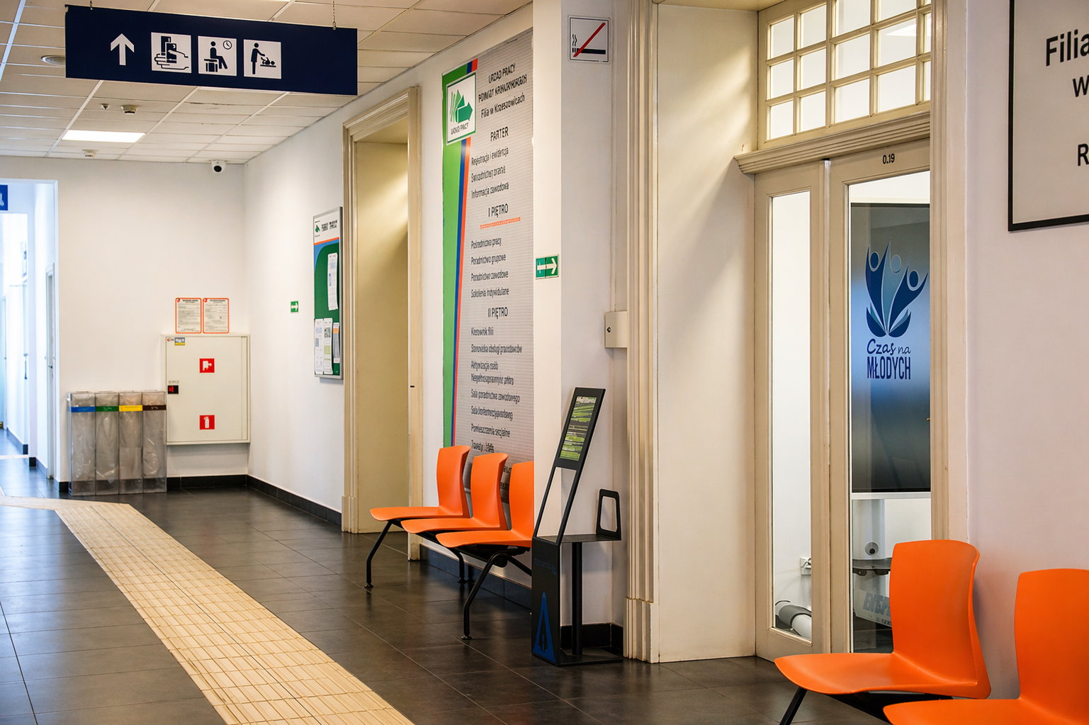 EKSPRES PRACA to przestrzeń zaprojektowana w nowoczesnym stylu, przypominająca bardziej strefę co-workingową lub klub młodzieżowy niż typową instytucję.