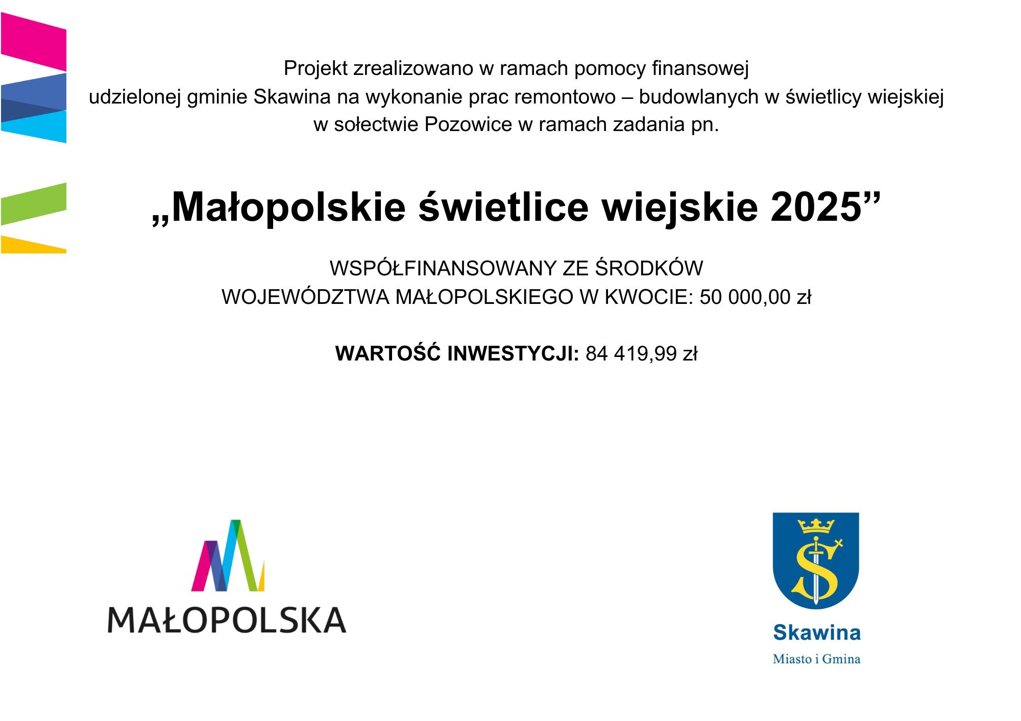 Gmina Skawina otrzymała dofinansowanie, w ramach programu „Małopolskie świetlice wiejskie 2025” ze środków Województwa Małopolskiego, na przeprowadzenie prac remontowych w świetlicy wiejskiej w sołectwie Pozowice.