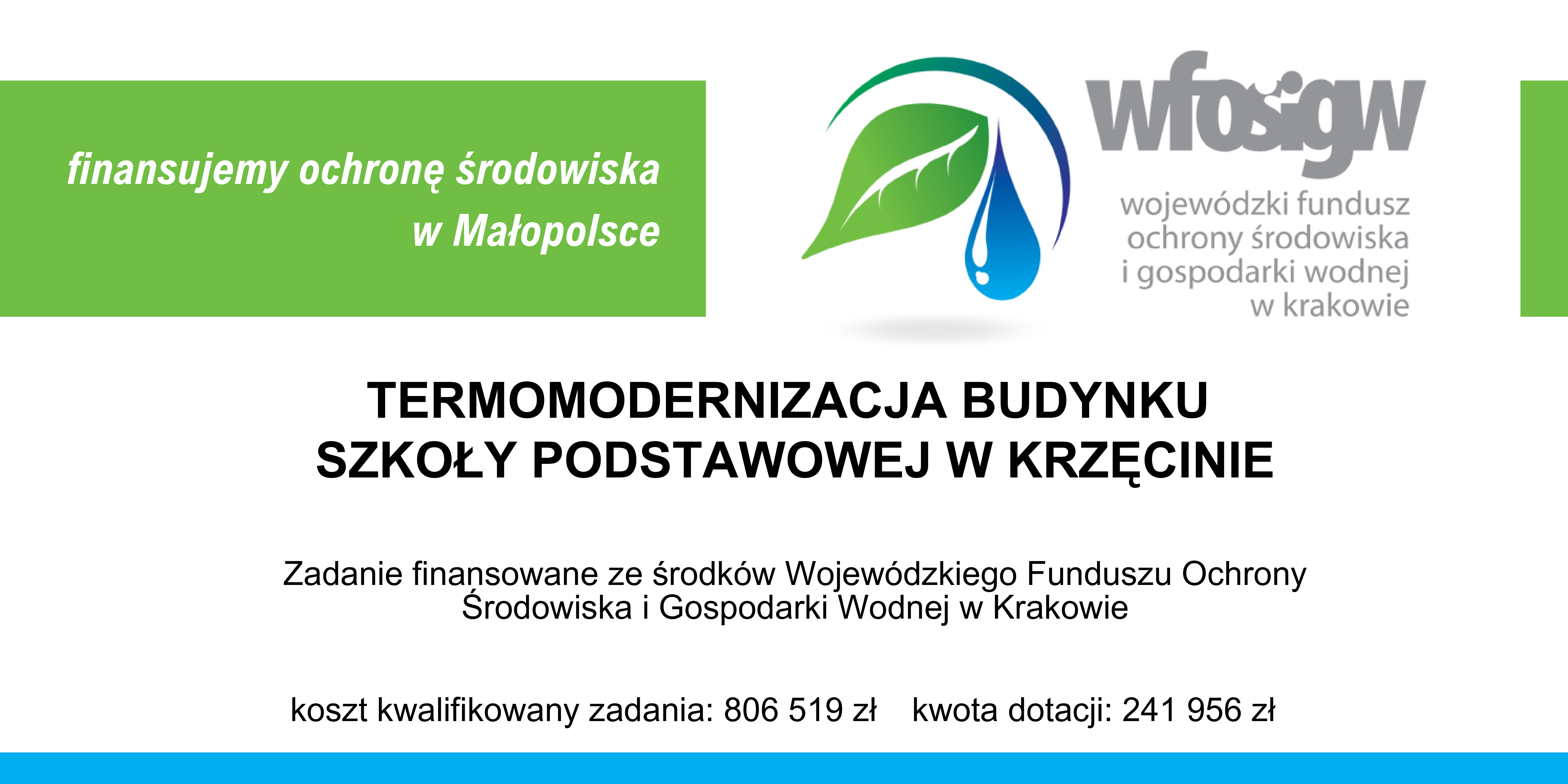Realizujemy zadanie pn. „Termomodernizacja budynku Szkoły Podstawowej w Krzęcinie”. Inwestycja jest prowadzona w ramach Programu Priorytetowego „Transformacja energetyczna i poprawa jakości powietrza”.