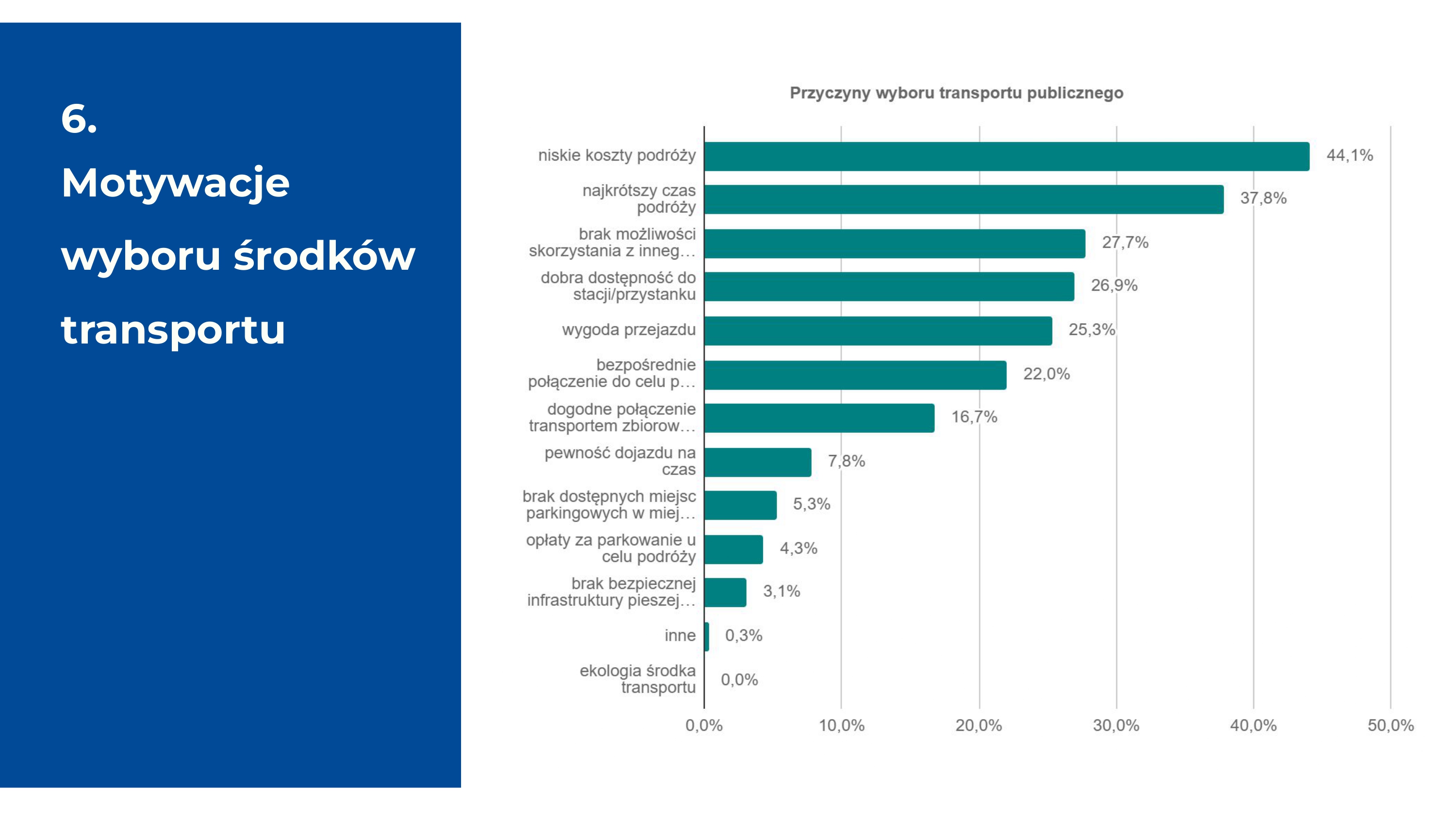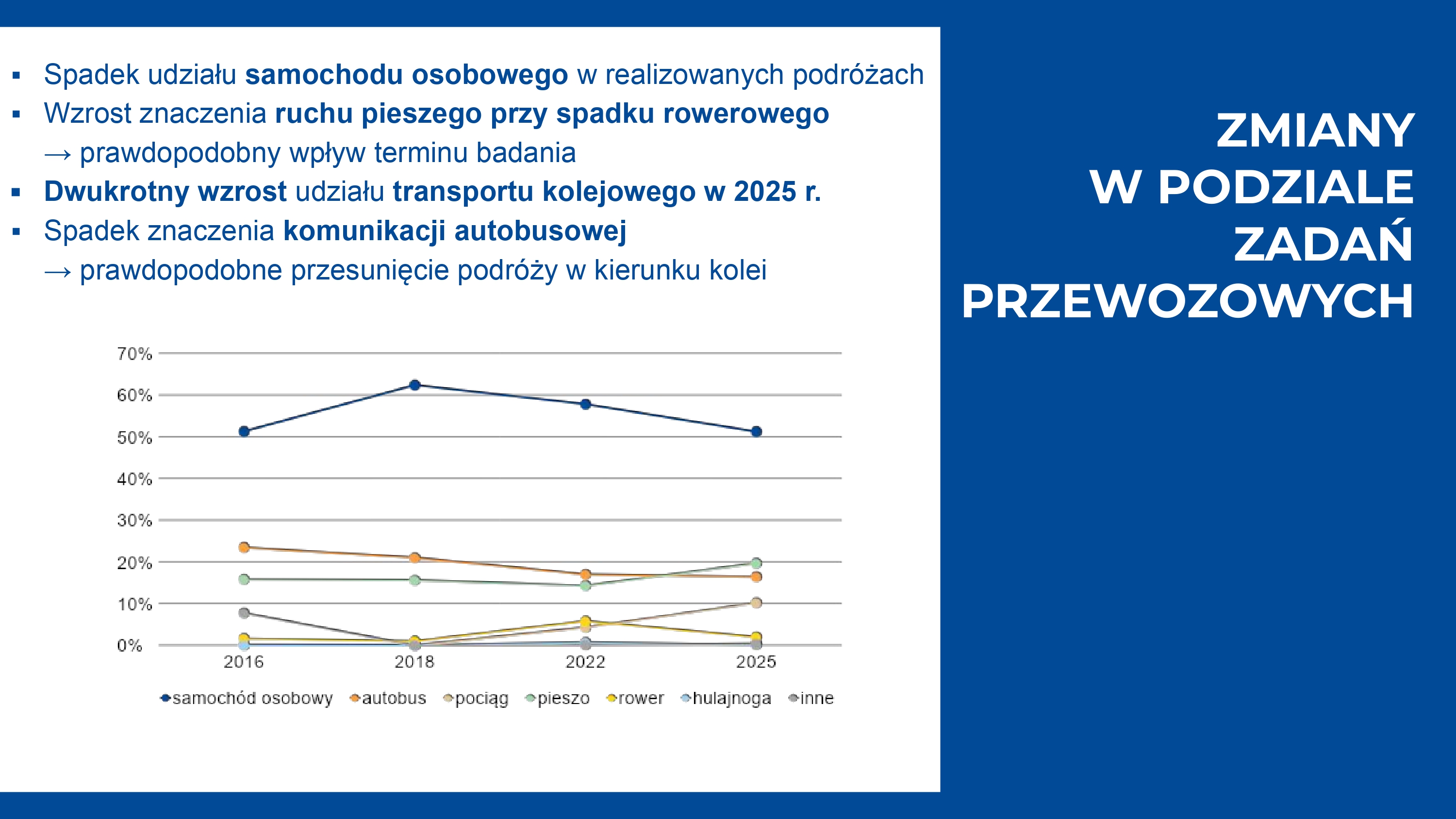 Wielkim wygranym badania jest transport kolejowy, którego udział wzrósł ponad dwukrotnie (do 10,2%). Widzimy tu wyraźny efekt synergii z naszymi liniami dowozowymi „S”, które ułatwiają dotarcie do przystanków kolejowych, tworząc spójny system transportu zbiorowego.