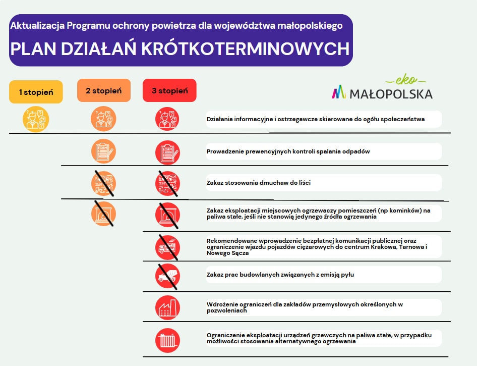 - rekomendowane wprowadzenie bezpłatnej komunikacji publicznej oraz ograniczenie wjazdu pojazdów ciężarowych do centrum Krakowa, Tarnowa i Nowego Sącza.