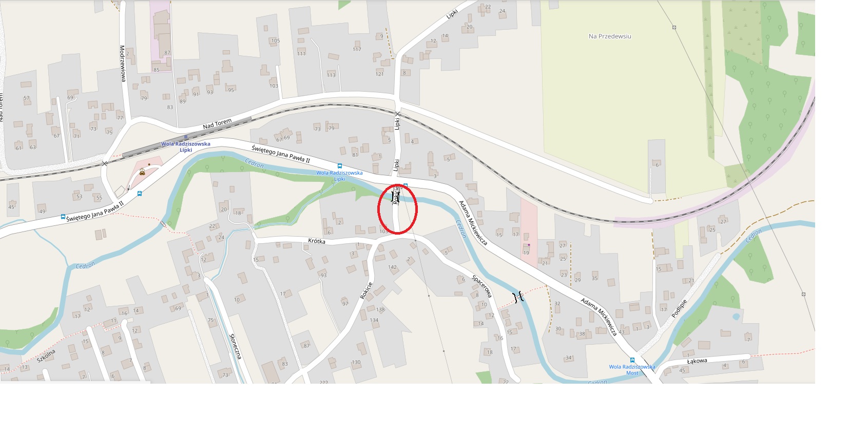 Informujemy, że od dnia 03.09.2025 r. na czas prac remontowych zostanie zamknięty most na rzece Cedron w Woli Radziszowskiej - droga gminna nr DG601175K (ul. Rokicie).
