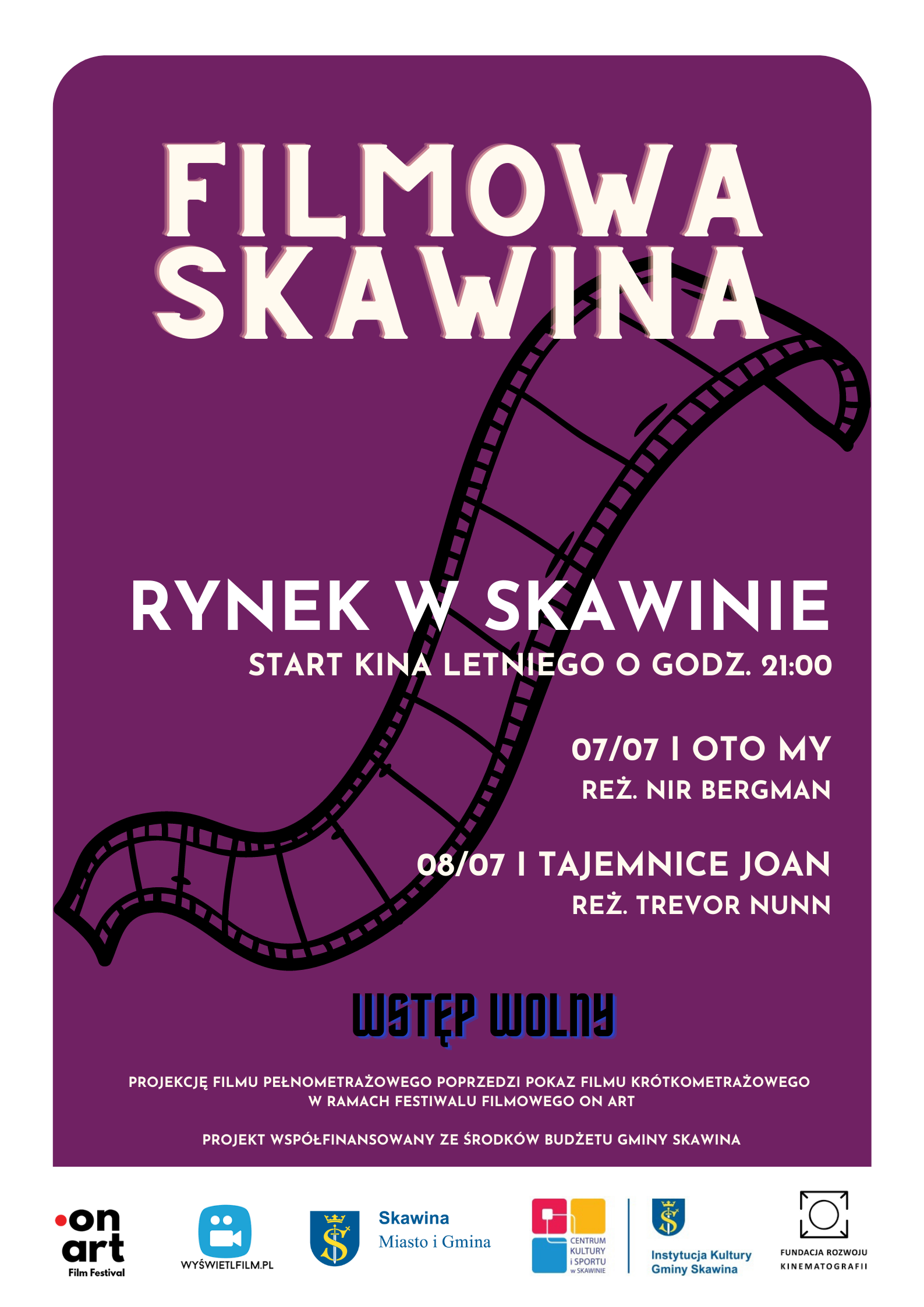 Filmowa Skawina. Rynek w Skawinie. Start kina letniego o godz. 21:00. 07/07 - Oto my, reż. Nir Bergman. 08/07 - Tajemnice Joan, też. Trevor Nunn. Wstęp wolny. Projekcję filmu pełnometrażowego poprzedzi pokaz filmu krótkometrażowego w ramach festiwalu filmowego On Art. Projekt współfinansowany ze środków budżetu Gminy Skawina.