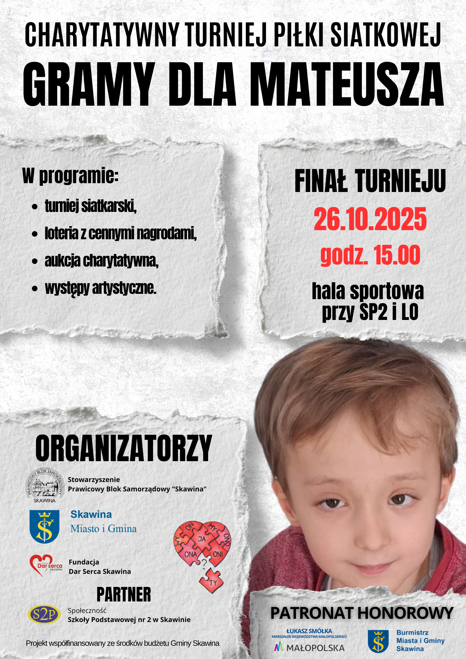 W tym roku nasz turniej ma wyjątkowy cel – gramy dla 10-letniego Mateusza, mieszkańca naszej gminy, ucznia skawińskiej szóstki, który od urodzenia zmaga się z poważnymi wadami układu nerwowego i kostno-mięśniowego. Mateusz przeszedł już wiele trudnych operacji ratujących życie i poprawiających jego stan, jednak codzienność wciąż wymaga od niego ogromnej siły i systematycznego wsparcia specjalistów.