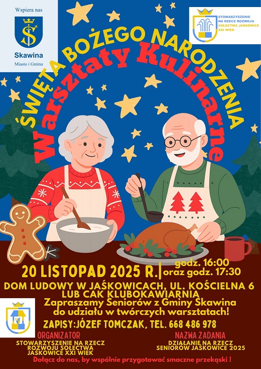 Stowarzyszenie Na Rzecz Rozwoju Sołectwa Jaśkowice XXI Wiek zaprasza wszystkich seniorów z gminy Skawina na twórcze warsztaty kulinarne - 20 listopada 2025 r. o godz. 16:00 i 17:30, Dom Ludowy w Jaśkowicach / CAK Klubokawiarnia, ul. Kościelna 6.